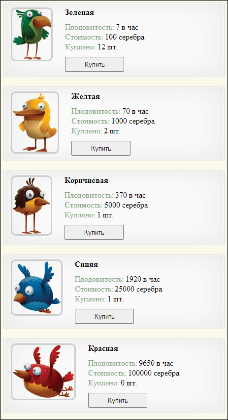 В этом магазине Вы можете приобрести различных птиц. Каждая птица приносит особые яйца, которые можно потом продать на рынке и обменять на реальные деньги. Каждая птица дает различное количество яиц, чем она дороже, тем больше приносит. Вы можете покупать их неограниченное кол-во раз, наши волшебные птицы не умирают и будут нести яйца всегда!